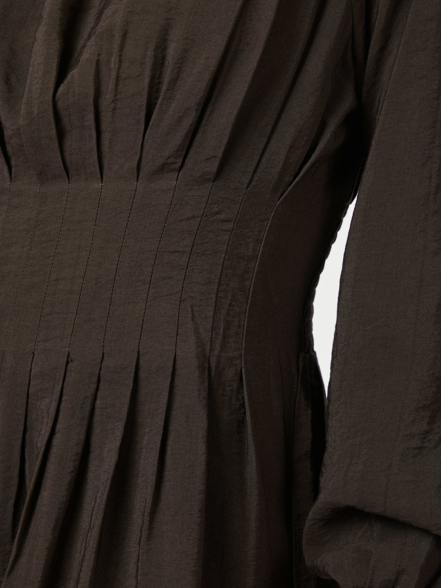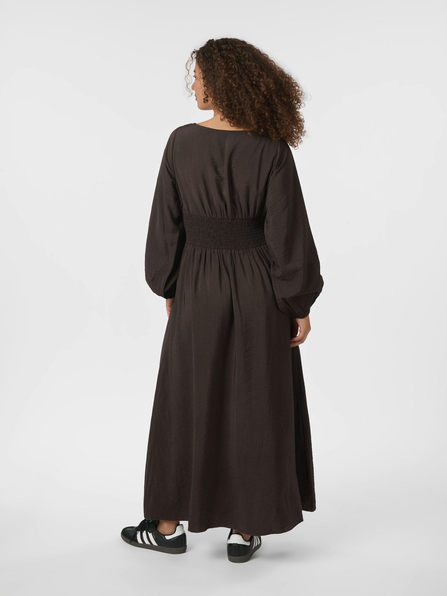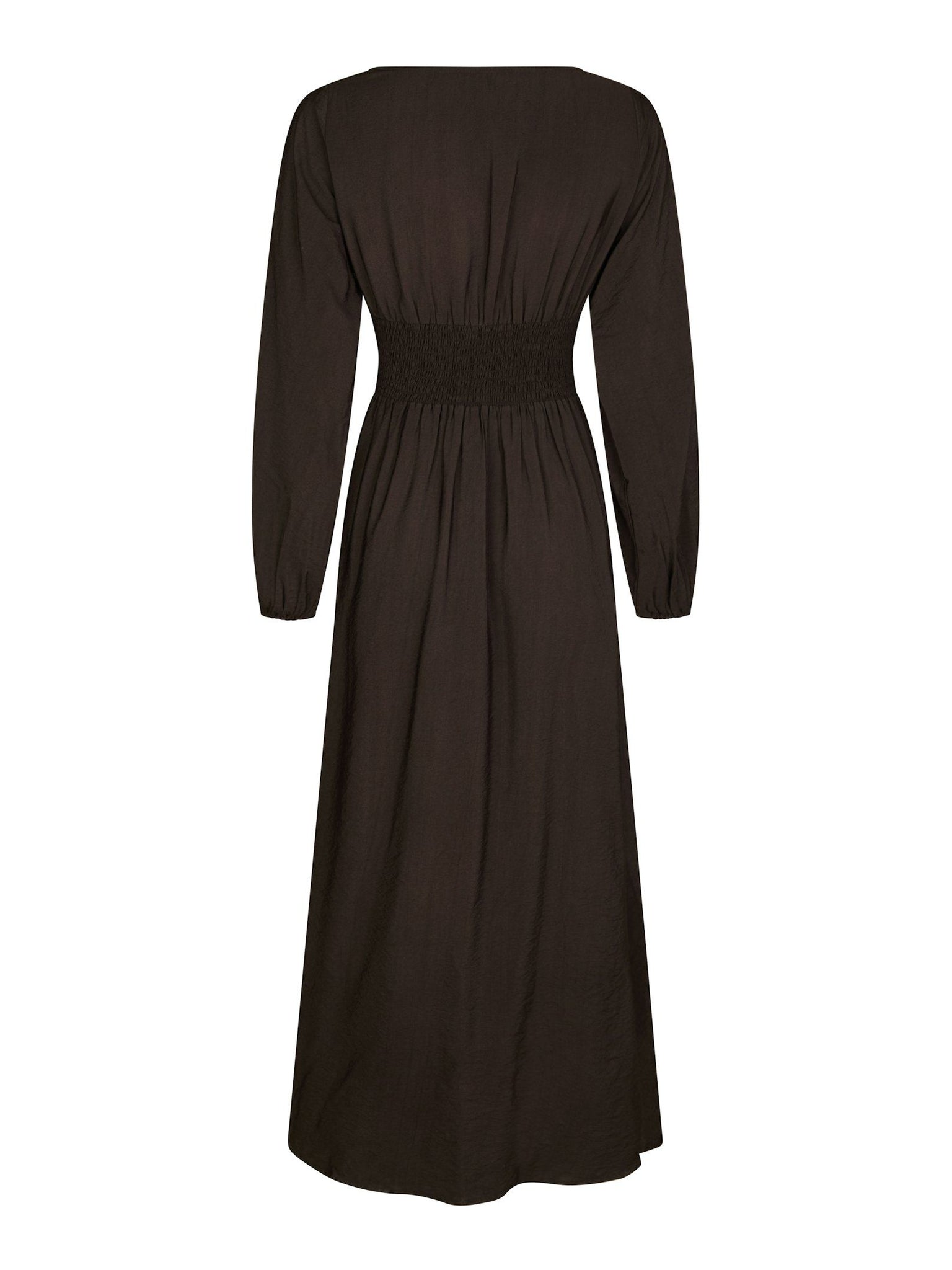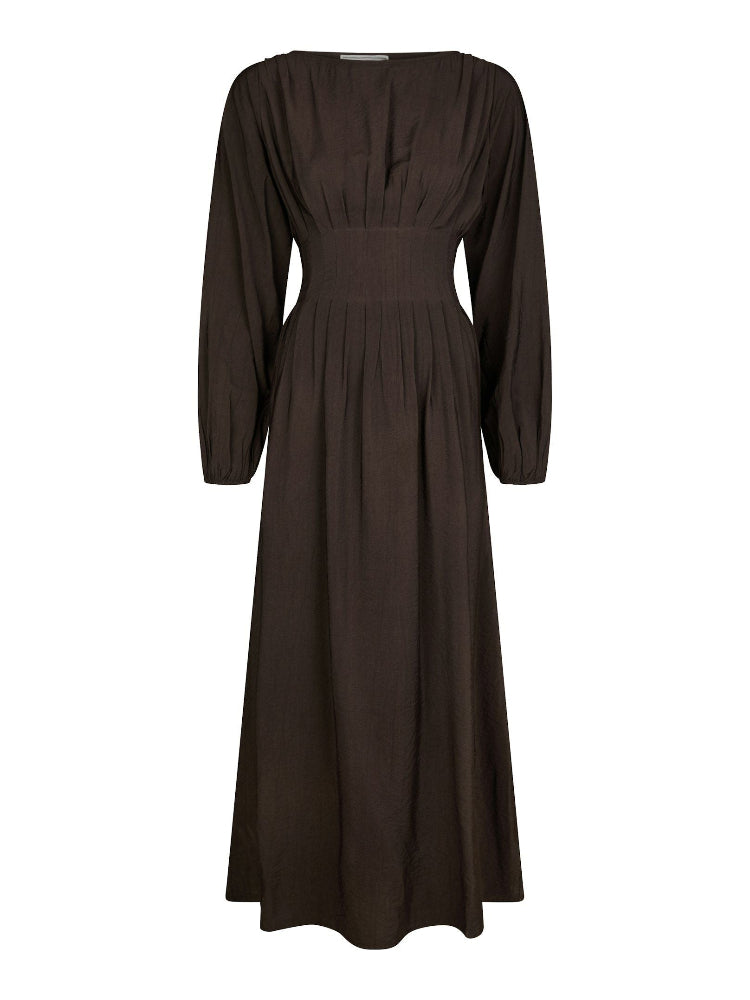 Cute long sleeved dress with pleats at waist and smock at back for a comfortable fit. The dress has a feminine boat neck. The model is 176 cm and wears a size 36.