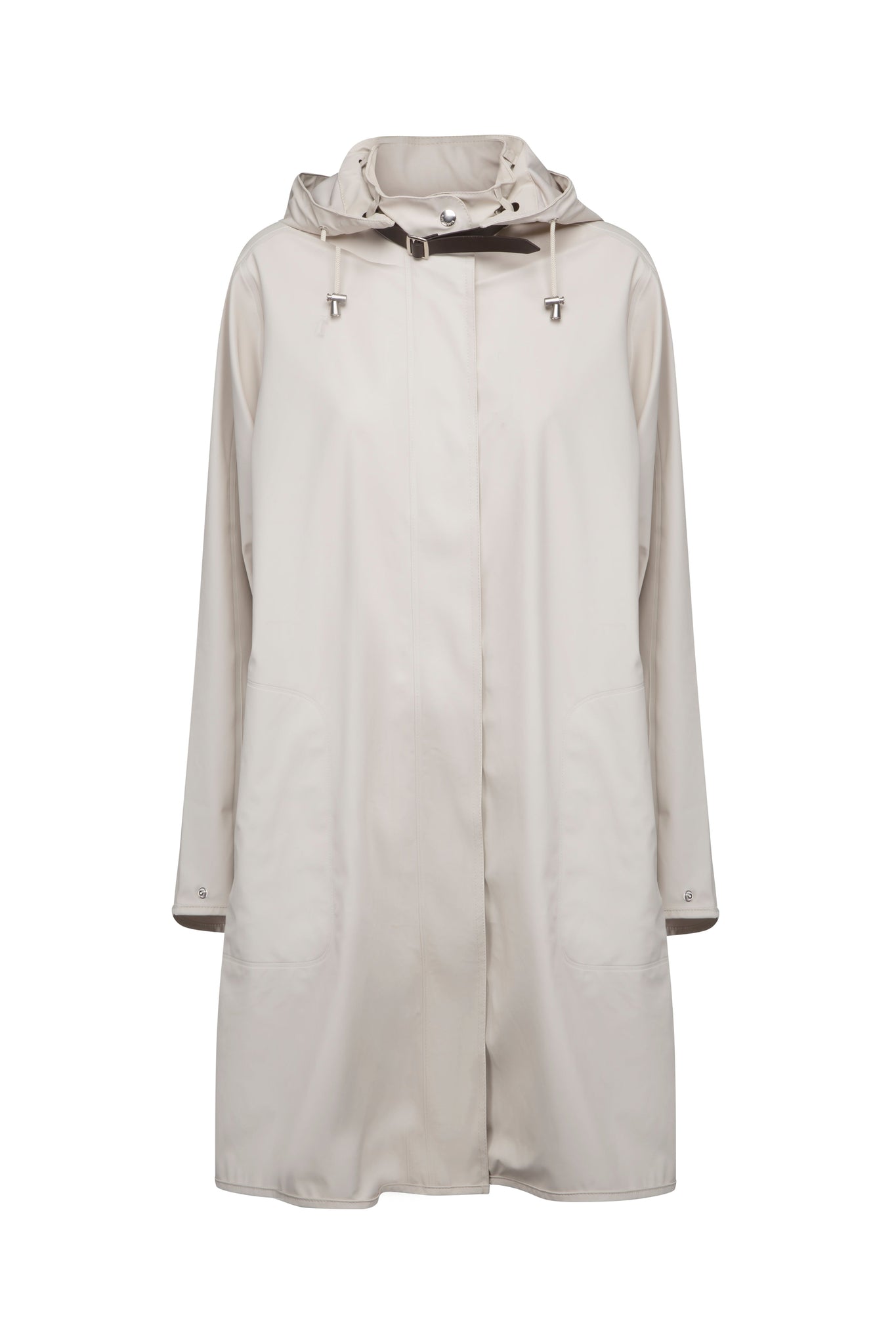A creme coloured knee-length Ilse Jacobsen raincoat with a detachable hood, side pockets, and a YKK 2-way zipper at the center front.
