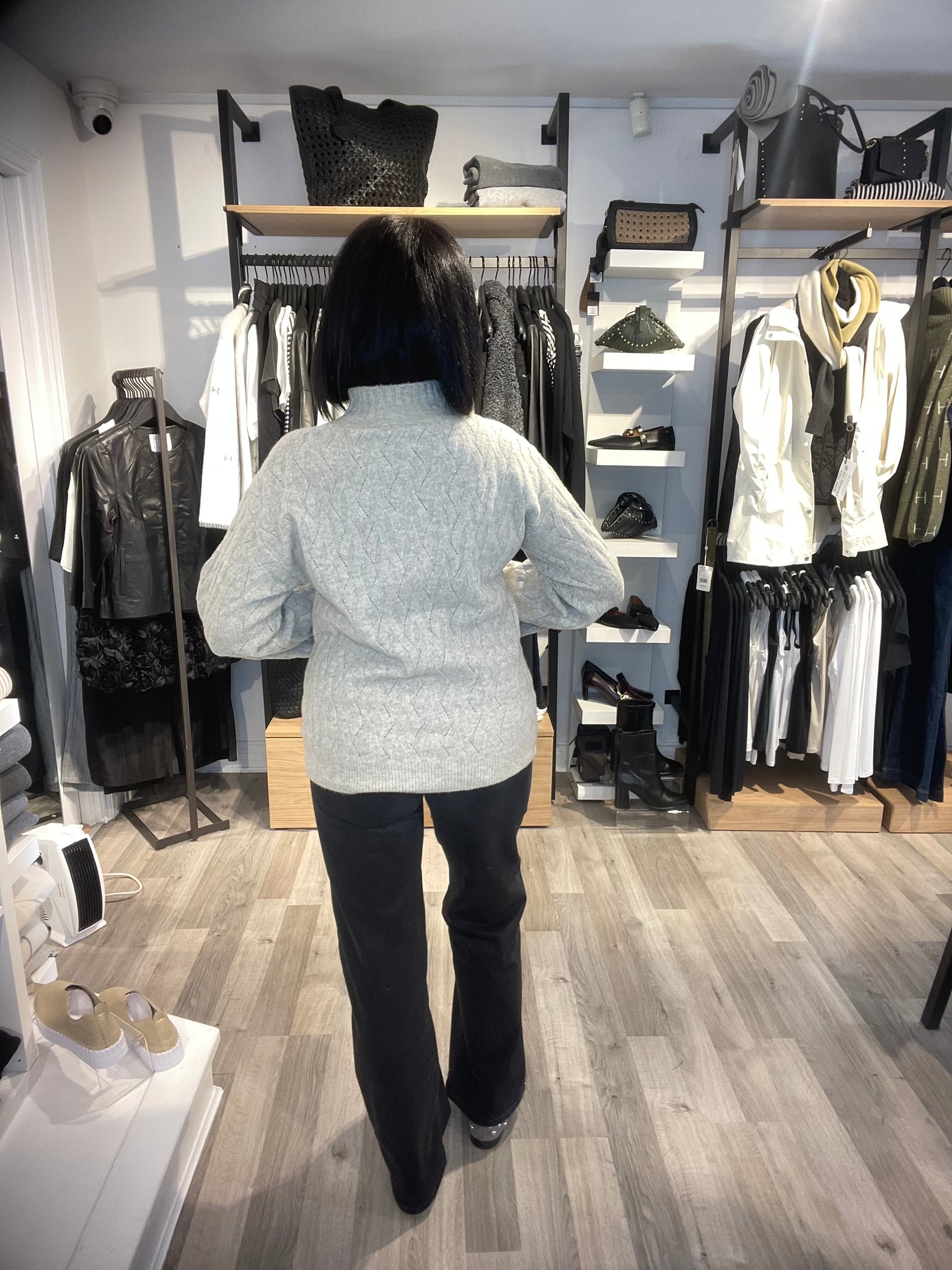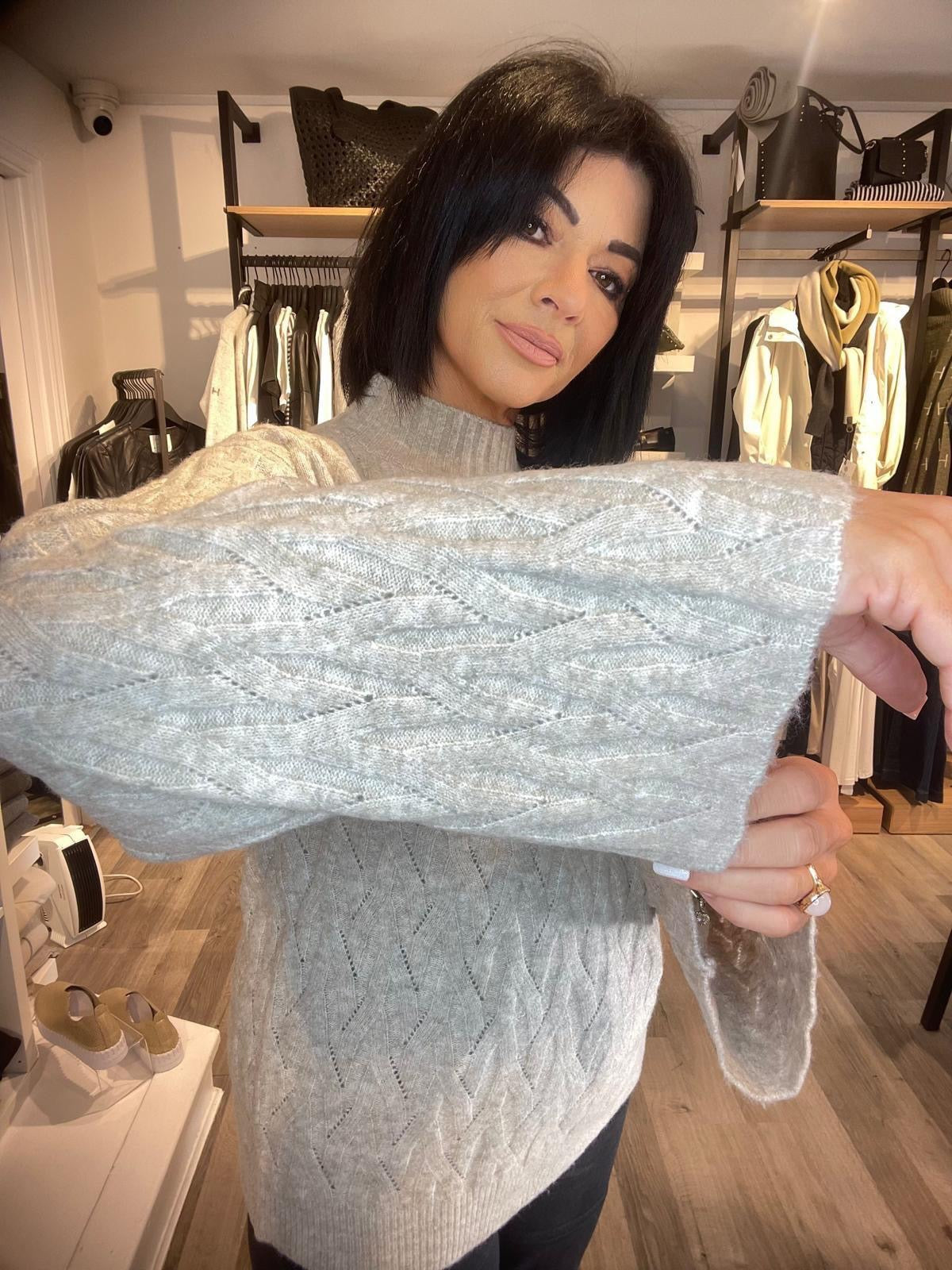 A beautiful quality knit sweater in straight style with detail knit pattern. Features a wide sleeve.