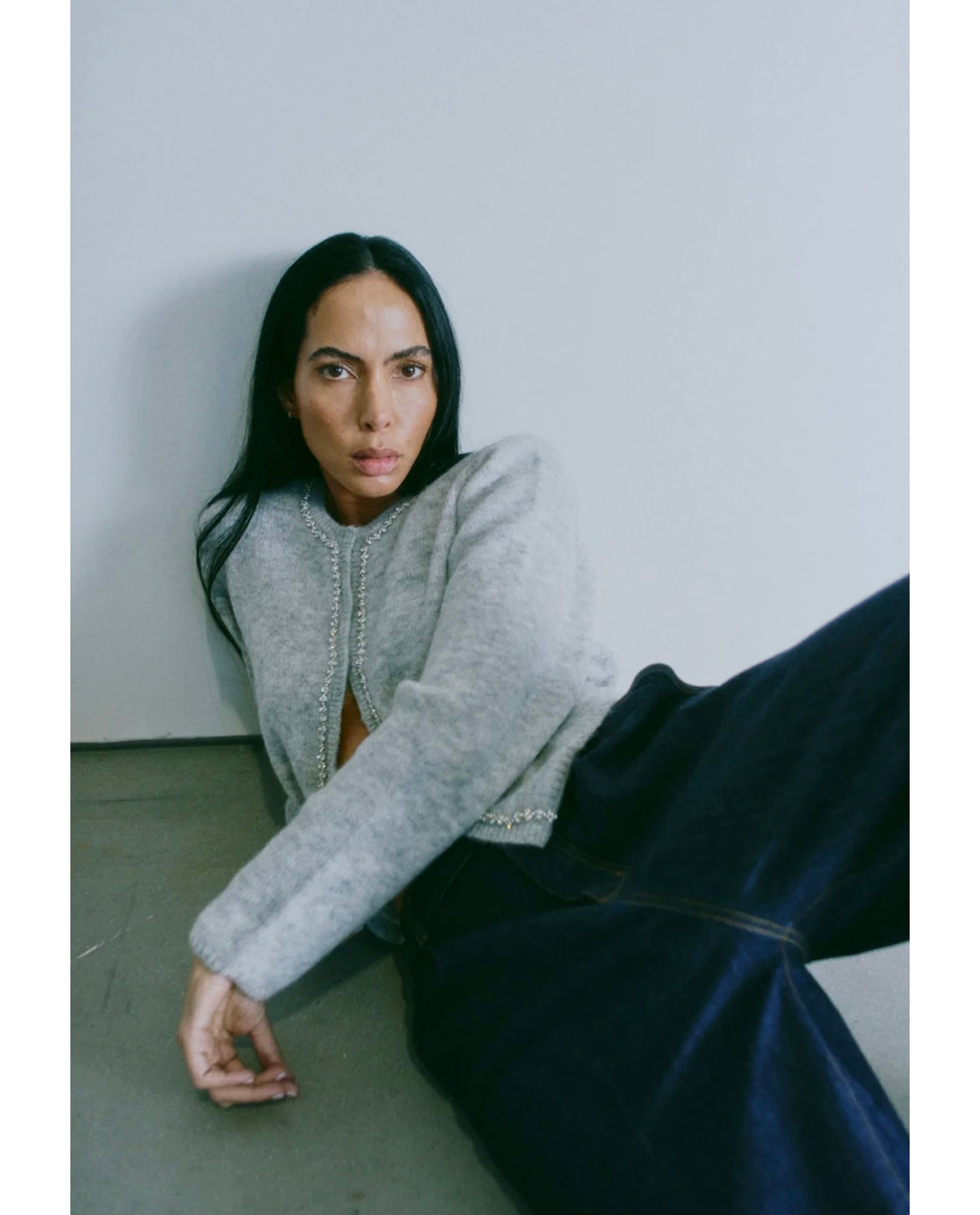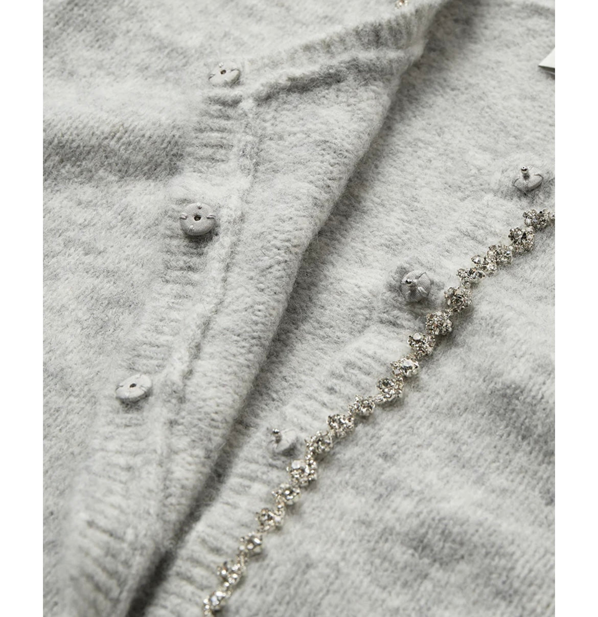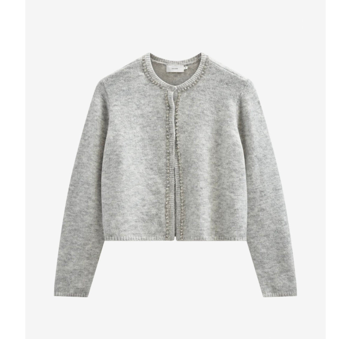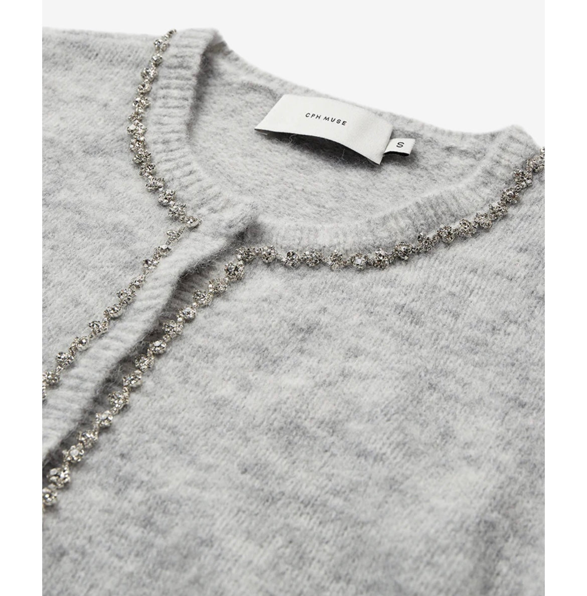 CMIBRA-CARDIGAN is a short, wide cardigan in a premium, knitted material with long sleeves, a concealed snap fastening at the top, narrow ribbing as well as elegant rhinestones along the neckline and front.
