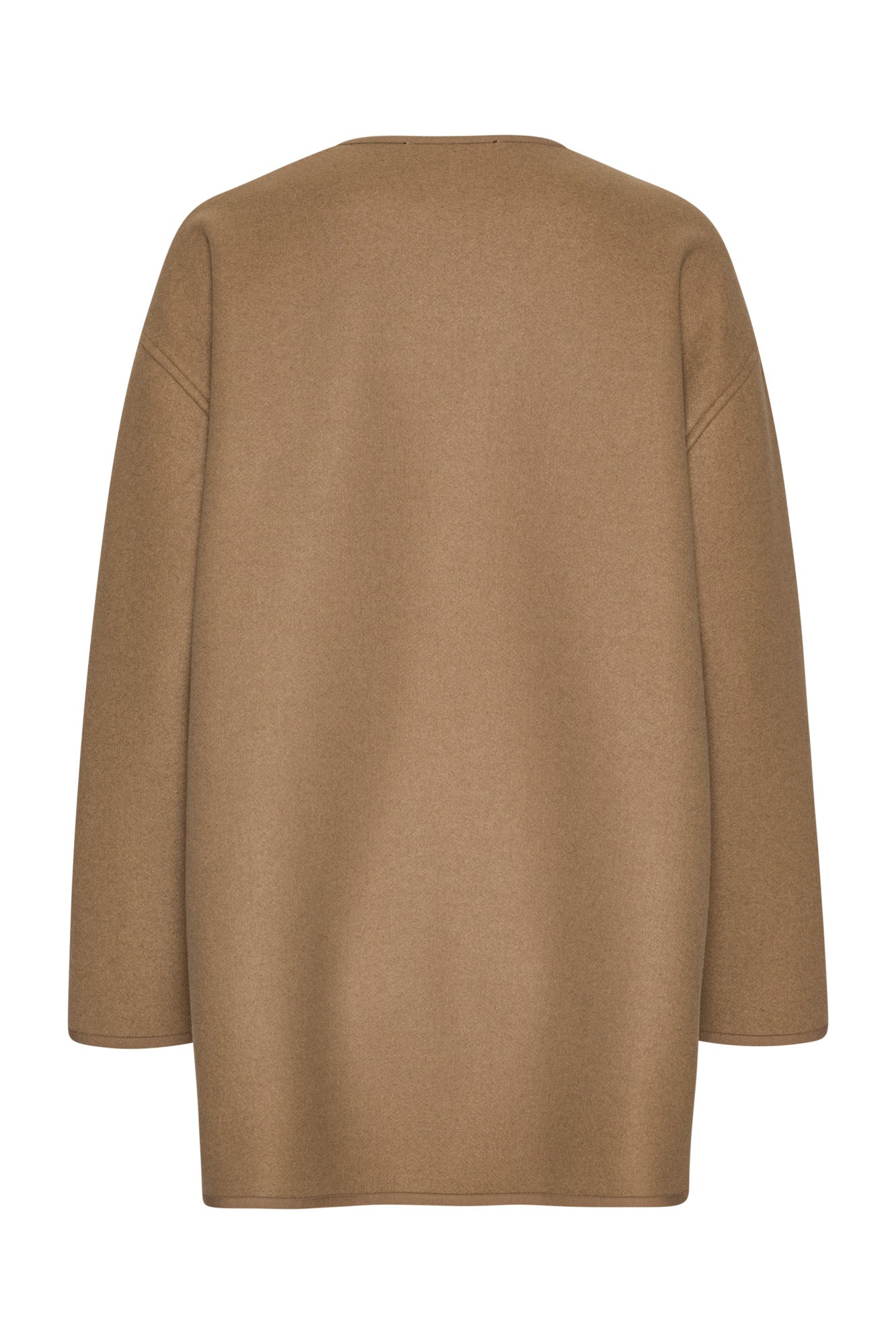 A soft felted jacket with a relaxed look and timeless feel. Designed with large patch pockets and finished with jersey binding at the hem, cuffs, and front placket for a clean, modern edge. The soft inner jersey lining adds comfort, while dropped shoulders and small side slits offer ease of movement. Fastened with a hidden hook and bar closure at the front, this piece is effortlessly versatile across seasons.