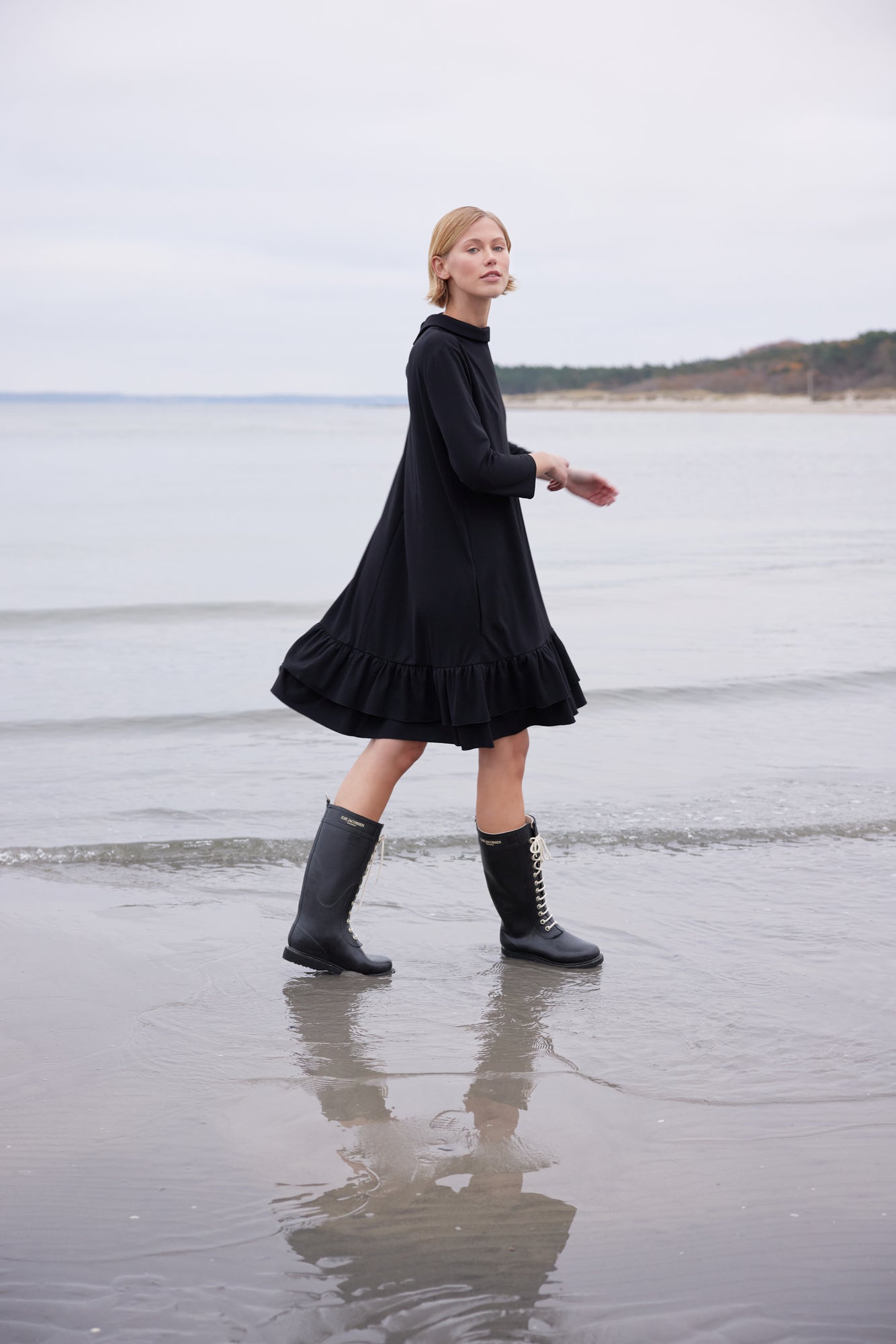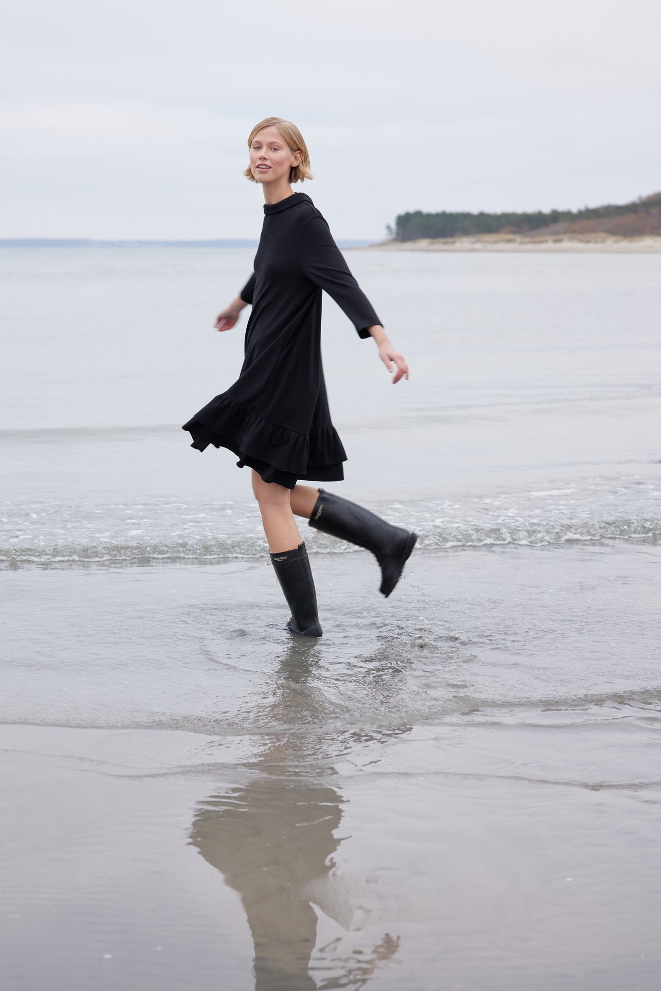 This A-line dress features long sleeves, two rows of ruffles at the hem, and hidden side pockets for practicality. The reversed collar with a small metal gold button and slit at back neck add refined details, making it perfect for both casual and special occasions.